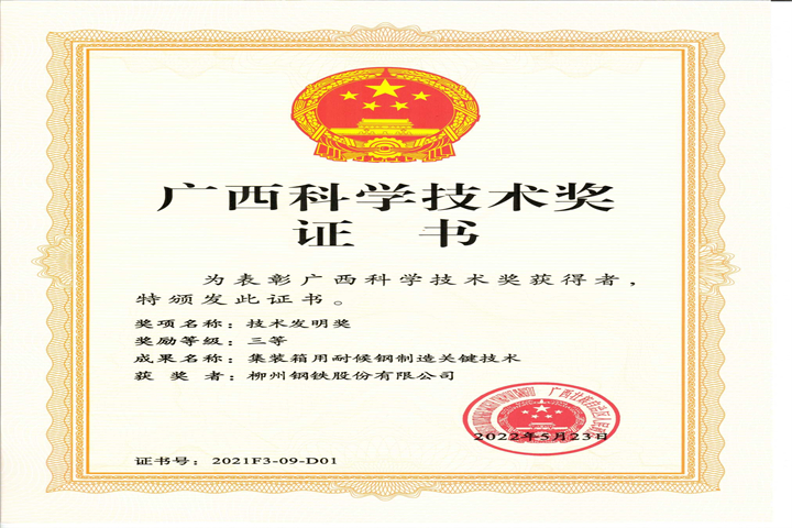 廣西科學(xué)技術(shù)發(fā)明獎(jiǎng)三等獎(jiǎng)-股份-集裝箱用耐候鋼制造關(guān)鍵技術(shù)